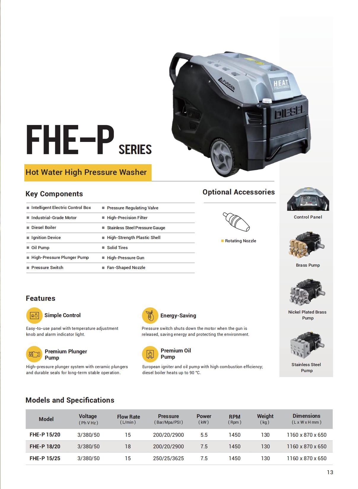 FHE-P 18/20 | 3/380/50 | 18 | 200/20/2900 | 7.5 | 1450 | 130 | 1160 x 870 x 650 |