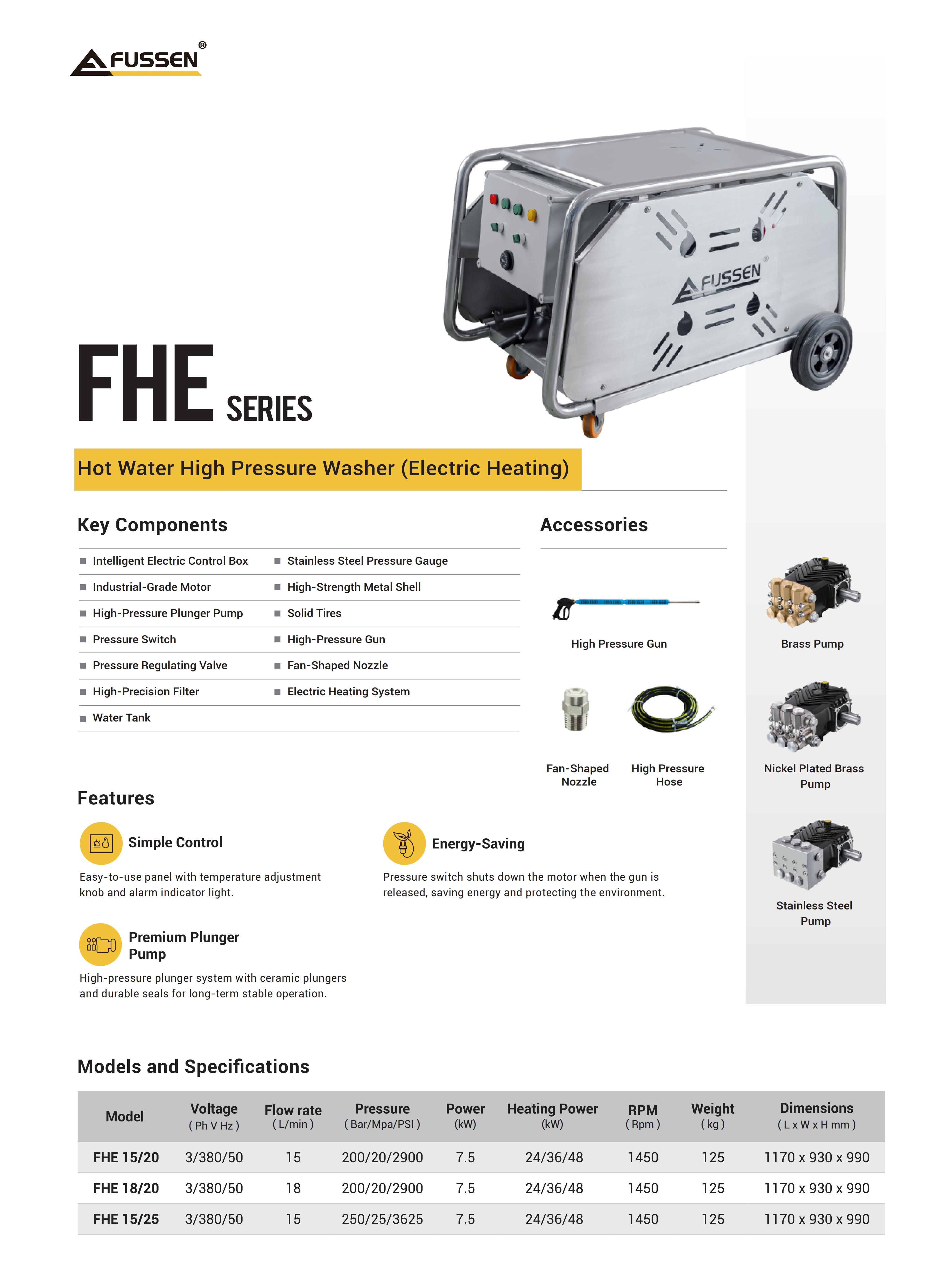 | FHE 18/20 | 3/380/50 | 18 | 200/20/2900 | 7.5 | 1450 | 130 | 1160 x 870 x 650 |